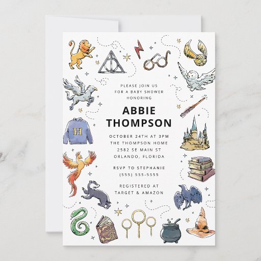Celebre a chegada do seu pequeno mago com este encantador convite de chá de bebê temático Harry Potter, apresentando símbolos icônicos do Mundo Mágico. Perfeito para fãs de todas as idades, este design caprichoso prepara o cenário para uma celebração mágica e memorável.