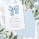 Um tema de chá de bebê de laço azul fofo e clássico apresentando um adorável laço aquarela azul bebê. Um visual de chá de bebê clássico simples e minimalista. Texto cinza em uma mistura de fonte serifada e tipografia cursiva. Celebre a futura mamãe com estilo! Você pode alterar as cores da fonte para o que desejar. Você também pode alterar a cor do fundo da frente e do verso. Convite de chá de bebê simples de laço azul aquarela para menino.