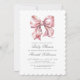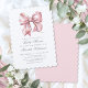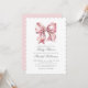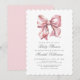 Um tema de chá de bebê de laço rosa fofo e clássico apresentando um adorável laço de aquarela em rosa suave. Este design mantém uma aparência simples, minimalista e atemporal de chá de bebê com um toque feminino doce. O texto aparece em fontes cinza suave usando uma mistura de tipografia serifada elegante e script fluído para manter tudo limpo e encantador.