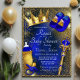Convite de chá de bebê do príncipe azul realeza com adoráveis elementos dourados e azul realezas em um lindo fundo azul e dourado. Este convite de chá de bebê do príncipe real é facilmente personalizado com os detalhes do seu evento.