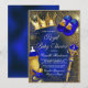 Convite de chá de bebê do príncipe real com bela coroa azul real e dourada e coisas de bebê em um belo fundo azul real e dourado. Você pode alterar o texto conforme necessário para o seu evento. Imprima em papel brilhante para obter os melhores resultados.
