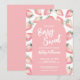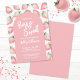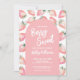 Um tema de chá de bebê 'Berry Sweet' fofo e feminino, apresentando morangos rosa em aquarela com folhas verdes. Uma tipografia de letra manuscrita branca em negrito misturada com uma fonte simples em um arco rosa bege. Você pode alterar as cores da fonte para o que desejar. Você também pode alterar a cor do fundo na frente e atrás, bem como no arco (círculo e retângulo no design). Convite de Chá de Bebê Morango Rosa em Aquarela Berry Sweet perfeito para a primavera e o verão, ou realmente em qualquer época do ano!