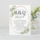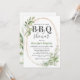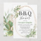 Convite elegante de chá de bebê de churrasco com verdura botânica apresentando um fundo branco estiloso que pode ser alterado para qualquer cor, uma moldura rústica falsa dourada, bela folhagem verde aquarela, destaques de brilho dourado e um modelo de celebração de chá de bebê de casal que é fácil de personalizar.