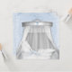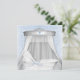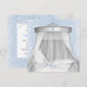 Lindo convite de chá de bebê em berço de vime branco com dossel elegante prateado e branco. Convite elegante e lindo para chá de bebê azul e branco. Fita azul com ilhós e fundo de renda azul com um berço de vime branco vintage com um laço azul.