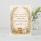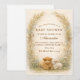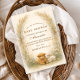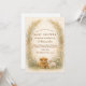 Um charmoso design rural com um bezerro fofinho, um cordeirinho doce e pintinhos amarelos aninhados entre flores silvestres suaves de prado. O fundo de pergaminho quente e tons terrosos suaves criam uma atmosfera rústica aconchegante com um toque delicado de livro de histórias. A folhagem delicada emoldura o layout enquanto a ilustração de animais da fazenda adiciona calor e personalidade. Perfeito para uma celebração neutra com tema rural e charme clássico de fazenda.
