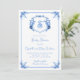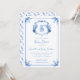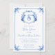 Personalize este convite de chá de bebê com brasão de monograma floral em azul aquarela caprichoso e elegante, pintado à mão, com seus próprios detalhes. Perfeito para a celebração do chá de bebê "é um menino".