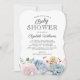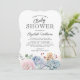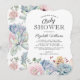 Convites elegantes para chá de bebê com fundo branco clássico, exibição em aquarela de flores pastéis e suculentas, e um modelo de chá de bebê estiloso e fácil de personalizar.