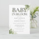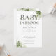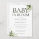 Convite de chá de bebê baby in bloom com uma elegante tipografia e belas folhagens botânicas verdejantes. Concebido por Thisisnotme©