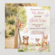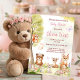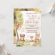 Convite de chá de bebê de menina com animais da floresta apresentando um urso, cervo e raposa em aquarela. Este design caprichoso da floresta inclui flores cor-de-rosa suaves e um doce sentimento de livro de histórias, perfeito para uma celebração encantada com tema da natureza.