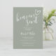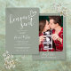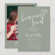 Um convite de chá de bebê minimalista moderno com um coração desenhado à mão e tipografia estilosa em um fundo verde sálvia e sua foto especial no verso. Projetado por Thisisnotme©