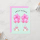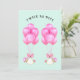 Convites criativos para chá de bebê de gêmeas meninas com arranjos exclusivos de balões cor-de-rosa e adoráveis gêmeas recém-nascidas usando capacetes.