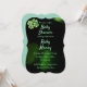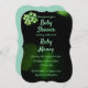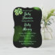 Fundo bokeh verde e preto com alguns trevos pintados à mão no canto superior esquerdo para dar sorte. O texto é branco com contorno verde e sombra verde clara como um convite totalmente personalizável para um chá de bebê para uma futura mãe.