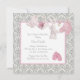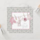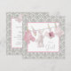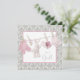 Convite de chá de bebê rosa e cinza damasco com botinhas rosa adoráveis, chupeta, botinhas e coelho em uma linha de roupa para festa de bebê menina. Você pode personalizar facilmente este convite de chá de bebê rosa e cinza para o seu evento adicionando detalhes do evento, estilo de fonte, tamanho e cor da fonte e texto.
