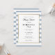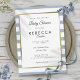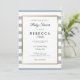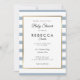 Com um fundo listrado azul desbotado e branco fofo, este convite elegante de chá de bebê, sprinkle ou chá de casal apresenta uma borda elegante em folha de ouro falso emoldurando seus detalhes definidos em tipografia sofisticada. Projetado por Thisisnotme