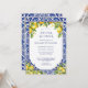 Este convite de chá de noiva com tema de limão apresenta ilustrações frescas em aquarela de limões e delicadas flores de limoeiro, combinadas com um padrão de azulejos mediterrâneos dispostos em uma moldura elegante para um visual elegante e sofisticado, banhado de sol.
