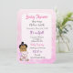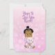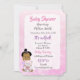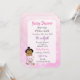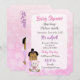 Convites de chá de bebê para menina hispânica ou afro-americana com ursinho de pelúcia e fundo roxo e rosa.