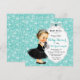 Convite de chá de bebê da Bebê & Company azul turquesa com adorável bebê menina morena de cabelo escuro vestindo vestido preto e pérolas em um lindo fundo azul turquesa. Este convite de chá de bebê preto e azul turquesa é facilmente personalizado para o seu evento, basta adicionar seus detalhes. Este design elegante é perfeito para um tema, ou chá de bebê com tema de Café da Manhã.