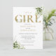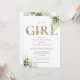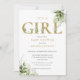 Convite de chá de bebê menina com elegante tipografia dourada e folhagem botânica verde. Desenhado por Thisisnotme©