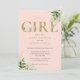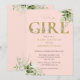 Convite de chá de bebê menina com elegante tipografia dourada e folhagem botânica verde em um fundo rosa. Criado por Thisisnotme©