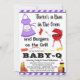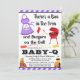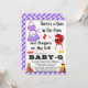 Convite de chá de bebê menina churrasco com avental e churrasco em um fundo xadrez roxo. Este convite de chá de bebê churrasco é facilmente personalizado para o seu evento, basta adicionar os detalhes do evento.