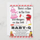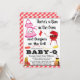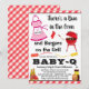 Convite de chá de bebê menina com comida no forno e churrasco com avental fofo e BBQ em um fundo xadrez vermelho. Este convite de chá de bebê de churrasco fofo é facilmente personalizado para o seu evento, basta adicionar os detalhes do evento.