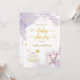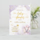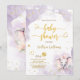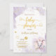 Convite de Chá de Bebê Menina Rosa Violeta com Dourado em Aquarela. Elefante fofo, borboleta, corações dourados e pontos ao redor, escrita à mão elegante e fundo roxo claro em aquarela. Este design é uma mistura de estilos caprichoso, moderno e elegante. Não se esqueça de descobrir a coleção completa.