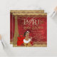 Convite de chá de bebê de Paris com bela Torre Eiffel dourada, elegantes pacotes de presentes de Paris vermelhos e dourados, linda menina étnica com tutu branco e colar de pérolas, escrita dourada sofisticada em um rico fundo de renda vermelha e dourada. Este convite de chá de bebê de Paris é facilmente personalizado para o seu evento, basta adicionar seus detalhes no estilo de letra e cor, e texto de sua escolha. Este é um design impresso sem renda real, diamantes, jóias, brilho, etc.