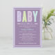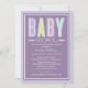 Este convite de chá de bebê ousado e moderno apresenta letras grandes e mistas "Bebê Menina" em uma suave cor lavanda roxa e branca contra um fundo cinza com uma borda de bolinhas lavanda. A paleta de cores roxa e cinza é uma escolha encantadora para um chá de bebê menina. Todo o texto é totalmente personalizável para a sua celebração.