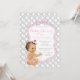 Convite de chá de bebê pérola com adorável bebê menina vestindo calças rosa franzidas e colar de pérolas em um lindo fundo pérola tufado com um lindo laço prateado e rosa. Este adorável convite de chá de bebê pérola rosa e cinza é facilmente personalizado para o seu evento, basta adicionar seus detalhes no estilo de fonte e redação de sua escolha. Este é um design impresso sem pérolas reais, tufamento, glitter, etc.
