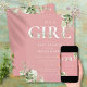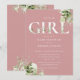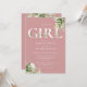 Convite de chá de bebê menina com tipografia elegante e bela folhagem botânica em um fundo rosa po dusty. Concebido por Thisisnotme©
