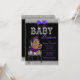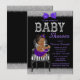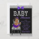 Convite de chá de bebê roxo, preto e prata com adorável bebê afro-americana vestindo um lindo tutu roxo e colar de pérolas sentada em uma cadeira listrada preta e branca em um elegante fundo preto, roxo e prata brilhante. Este convite de chá de bebê moderno roxo, preto e dourado é facilmente personalizado para o seu evento, basta adicionar seus detalhes no estilo de fonte e cor de sua escolha. Você pode alterar a cor do fundo. Este é um design impresso sem brilho, laços, etc. reais.