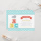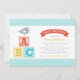 Este convite de chá de bebê temático de alfabeto adorável apresenta um pequeno pássaro fofo empoleirado em blocos de letras ABC coloridos com um título em faixa e borda de bolinhas azul aqua alegre. O design brilhante e divertido é perfeito para a celebração de um menino. Toda a redação é totalmente personalizável para o seu evento.