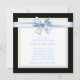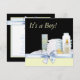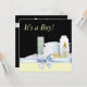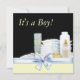 Convite de chá de bebê menino adorável com itens de berçário envoltos em laço azul doce, blocos de bebê, fraldas, pato de borracha amarelo, mamadeira e pó. Adicione seus detalhes na frente e/ou verso adicionando detalhes do evento, estilo de fonte, tamanho e cor da fonte e texto.