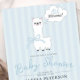 Personalize este convite de chá de bebê do adorável Oh Mmama Llama menino em azul claro listrado, apresentando listras suaves azuis e brancas transparentes, adorável pequeno lhama com balão de fala engraçado e tipografia cursiva na frente com código QR do registro de bebê e detalhes do site no verso! Adicione facilmente os detalhes da redação do chá de bebê e envie seu código QR do registro. Solicitações de design personalizado e detalhes do modelo de convite são sempre bem-vindos - clique no botão "mensagem" ou envie um e-mail direto: contact@figandlilyco.com. Design criado com carinho pela Fig and Lily Studios - enviando bênçãos e agradecimentos por estar aqui conosco!