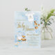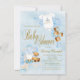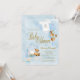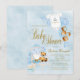 Convites de chá de bebê menino com aquarela com adorável ursinho, blocos, cadeira elegante, coroa de príncipe e macacãozinho com texto que pode ser alterado em um lindo fundo de aquarela azul bebê. Este convite de chá de bebê com aquarela azul bebê e dourado é facilmente personalizado para o seu evento apenas adicionando os seus detalhes.