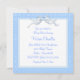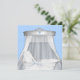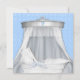 Bela cama de vime branca com renda e dossel branco prateado elegante. Fita de renda azul elegante e fundo de renda azul com cama de vime branca vintage com um laço azul. Adicione seus detalhes na frente e no verso adicionando os detalhes do seu evento, estilo de fonte, tamanho e cor da fonte e texto. Observe que todos os desenhos de convite que você encontrará no Zazzle são gráficos impressos em papel simples sem joias, laços, relevos, rebaixados ou peças ou partes adicionadas.