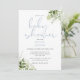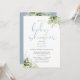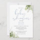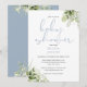 Um convite de chá de bebê elegante e sofisticado, apresentando uma tipografia azul empoeirada elegante e folhagem botânica verde. Criado por Thisisnotme©
