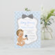Convite de chá de bebê de gravata borboleta para menino com adorável bebê menino usando fralda e segurando um chocalho em um lindo fundo de diamante tufado azul bebê com fundo de gravata borboleta cinza. Este adorável convite de chá de bebê azul e cinza é facilmente personalizado para o seu evento, basta adicionar seus detalhes no estilo de fonte e redação de sua escolha. Este é um design impresso sem gravata borboleta real, diamantes, tufamento, brilho, etc.