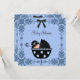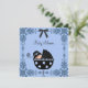 Convites de chá de bebê menino preto e azul adoráveis. Este convite de chá de bebê azul e preto apresenta um doce bebê menino em uma carruagem preta e azul com uma borda elegante e laço preto e é facilmente personalizado para o seu evento, basta adicionar os detalhes do evento, estilo de fonte, tamanho e cor da fonte e texto.