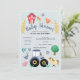 Este convite de chá de bebê meninos fofo, rústico e caprichoso apresenta desenhos animados de animais da fazenda e um padrão de animais da fazenda, com um trator azul, cavalo, porco, coelho, galinhas, celeiro vermelho e flores, e pode ser personalizado com os nomes dos pais e outros detalhes necessários para a sua festa. O complemento perfeito com tema de fazenda para o chá de bebê rústico do casal misto.