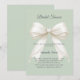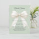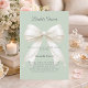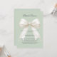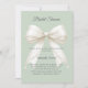 Celebre a noiva com este elegante convite de chá de noiva verde sage. O design é centrado em um grande laço de água-forte marfim detalhado com fios de pérolas sobre um fundo verde sage suave. Este convite é uma escolha ideal para um chá de noiva sofisticado com tema de jardim ou uma celebração clássica de coquette. Personalize e adicione um nome e detalhes da festa.