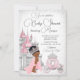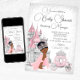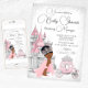 Convite de chá de bebê princesa Afro cor-de-rosa e prata com adorável bebê princesa com cabelo afro fofo com coroa de diamantes e capa em um lindo fundo brilhante cor-de-rosa e prata. Este convite de chá de bebê princesa cor-de-rosa e prata é facilmente personalizado com os detalhes do seu evento.