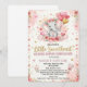 Organize um chá de bebê dos sonhos com este encantador convite "Little Sweetheart", projetado especificamente para a celebração do Dia dos Namorados de uma bebê menina. Este cartão apresenta um adorável elefante bebê em aquarela segurando balões em forma de coração, aninhado entre peônias rosa suave e estrelas douradas.