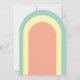 Um convite de chá de bebê em forma de arco retrô com um arco-íris de 3 arcos (azul, amarelo e vermelho) e fontes funky com efeito de texto sombreado retrô para a ocasião e 3 flores (vermelho, laranja e azul) acima, à direita.