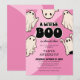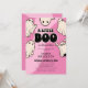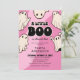 Convites de chá de bebê de menina de Halloween fofos com um fundo rosa groovy, um grupo de fantasmas retrô, a divertida frase “um pequeno boo está quase chegando”, e um modelo de texto moderno que é fácil de personalizar, seus convidados vão morrer de vontade de pôr as mãos nesses convites!