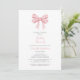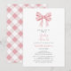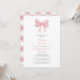 Acolha a chegada de um precioso pequeno com nosso convite de chá de bebê elegante em rosa pastel e branco. Com um delicado laço rosa coquette no topo, este design atemporal apresenta caligrafia estilosa em rosa e cinza para apresentar os detalhes do evento. No verso, descubra um suave padrão xadrez rosa e branco coordenado, estilizado na diagonal.