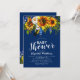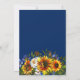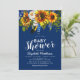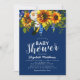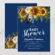 Convites de chá de bebê rústico country boho com fundo azul marinho que pode ser alterado para qualquer cor, um display floral de girassóis aquarela, penas e um modelo de festa de chá de bebê moderno.
