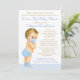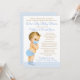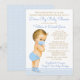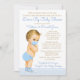 Convite de chá de bebê surpresa com adorável bebê loiro usando máscara e roupa azul em um fundo azul pastel e dourado. Este chá de bebê surpresa é facilmente personalizado para o seu evento, basta alterar o texto. Você pode alterar a cor do texto, escolher o estilo da fonte, a redação, etc.