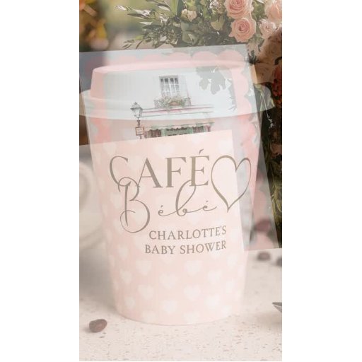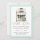 Traga o charme de Paris para a sua celebração com este convite de chá de bebê temático Café Bébé Paris. Com uma ilustração chic em aquarela de uma fachada de café francês, completa com detalhes em pastel, flores e uma linda bicicleta vintage, este convite é perfeito para organizar um chá de bebê elegante e único.