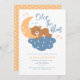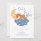 Convite de Chá de Bebê Estamos Sobre a Lua com adorável ursinho de pelúcia dormindo sobre nuvem azul fofa e meia lua crescente. Convite de chá de bebê doce menino ou menina.